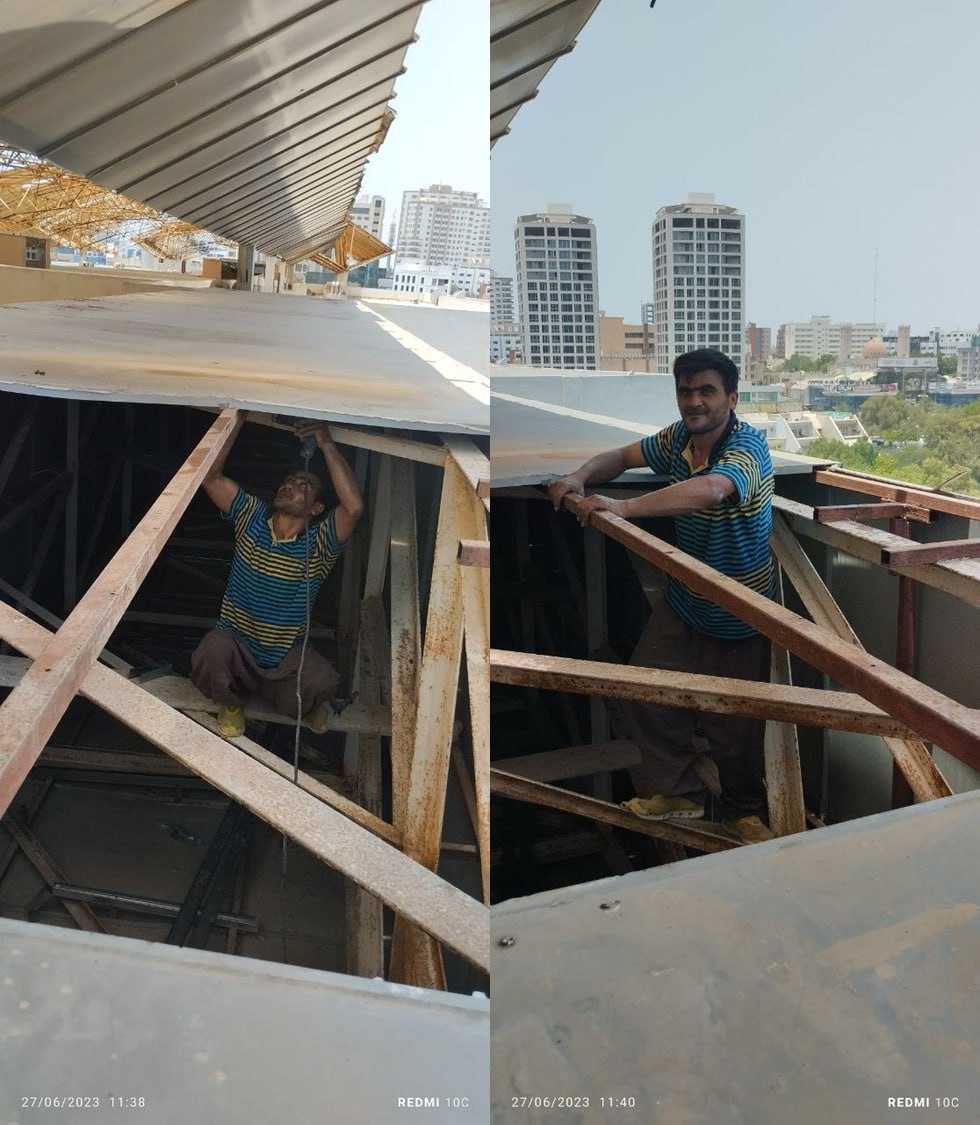 در طی سالهای متمادی، منافذ و سوراخهای متعددی برروی سازههای کامپوزیتی بوجود آمده بود. به سبب وجود این سوراخها، در زمان بارانهای سیلآسا، آب فراوانی در داخل سازه جمع میشد که باعث زنگزدگی و پوسیدگی سازه از درون گردیده بود. این زنگزدگیها از یک طرف و بازشدن درز و چسب بین تایلها از طرف دیگر، احتمال فروپاشی سازه و بروز خطرات جدی را فراهم آورده بود. با توجه به وضعیت نابسامان سازهها، هر آن، امکان فروریختن بخشهایی از آنها وجود داشت. لذا، پس از تنظیم قرارداد با پیمانکار، داربستهای داخلی اصلاح شد، منافذ داخل سازهها بطور کامل با چسب ماستیک پوشانده شد و تایلهای آسیبدیده تعویض شدند.